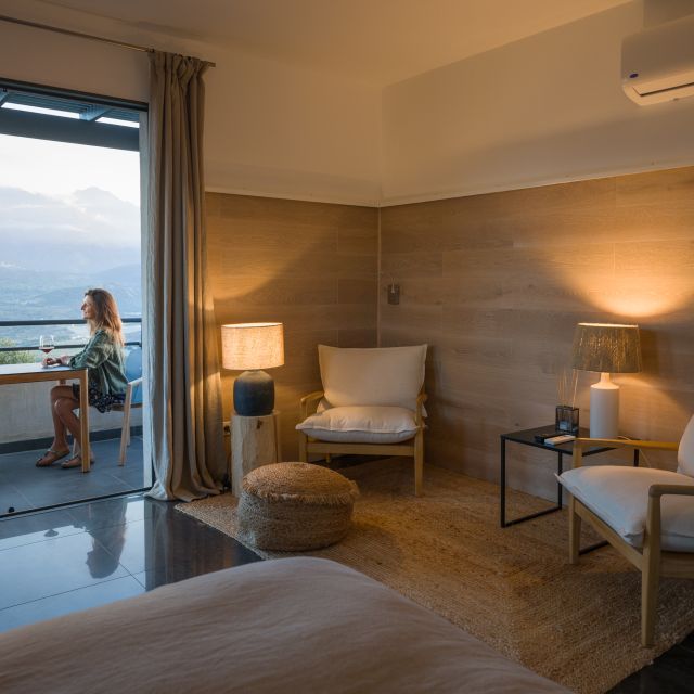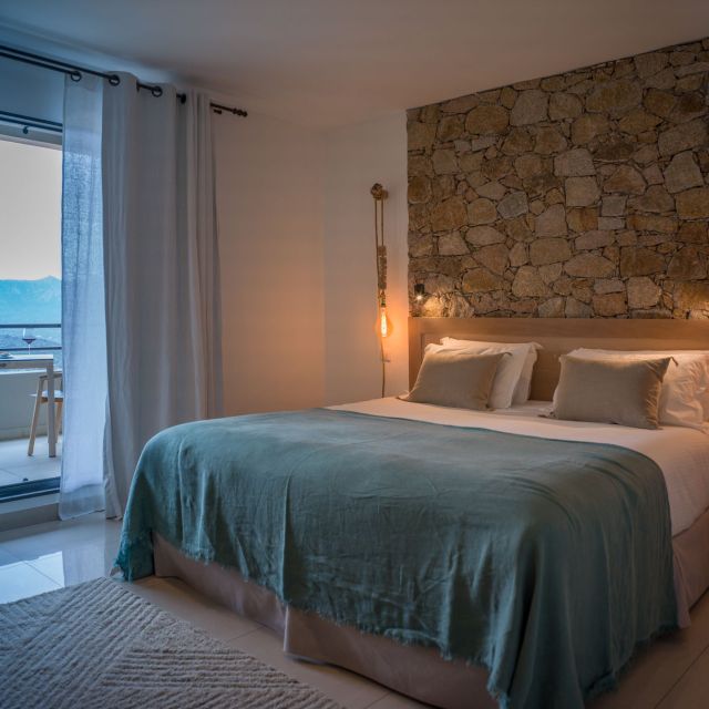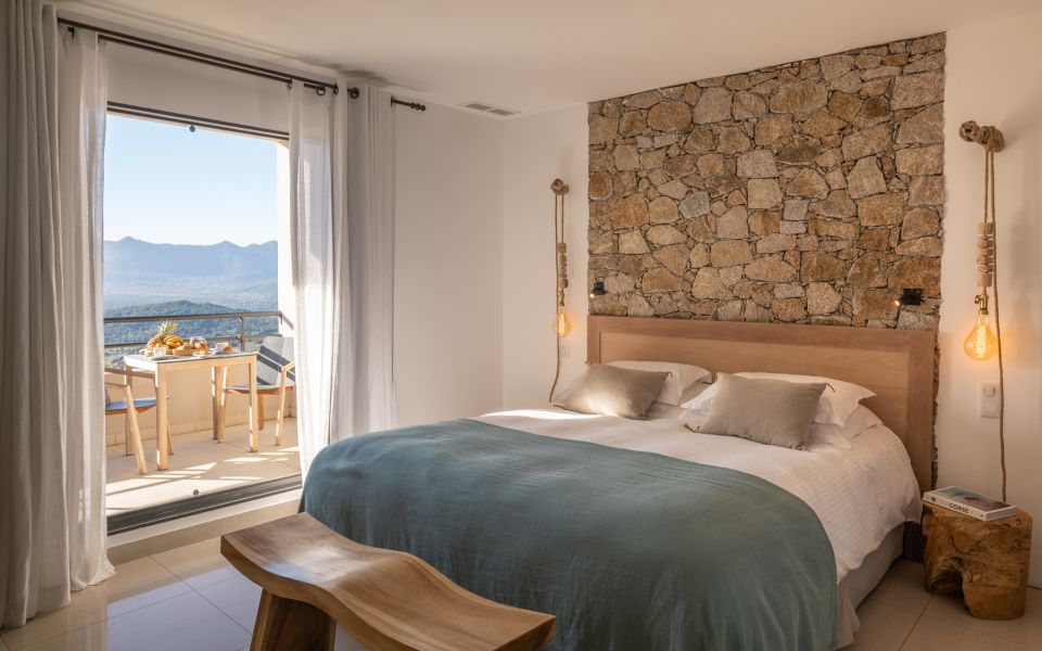 Les 6 chambres supérieures de l’hôtel sont situées à l’étage des petites villas. Elles bénéficient d’une vue surplombante sur la vallée, le lac et la chaîne de montagne.