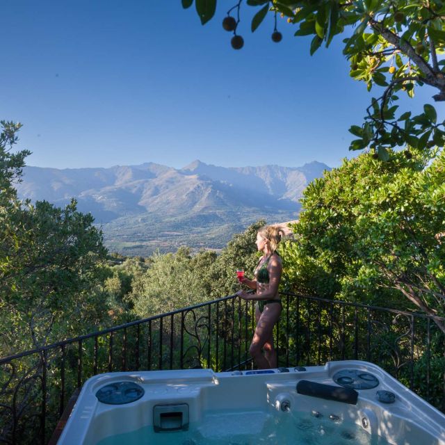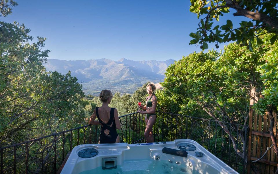 Installé sur un piton rocheux, notre jacuzzi domine la vallée et fait face à la chaîne de montagnes.